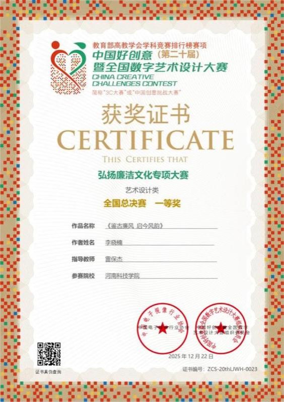 设计硕士研究生李晓楠同学凭借作品《鉴古廉风·启今清韵》系列海报,从全国26782件参赛作品中脱颖而出,斩获弘扬廉洁文化专项大赛艺术设计类赛道全国总决赛一等奖,充分彰显了学院在设计硕士专业学位研究生人才培养领域的扎实成效与鲜明特色。