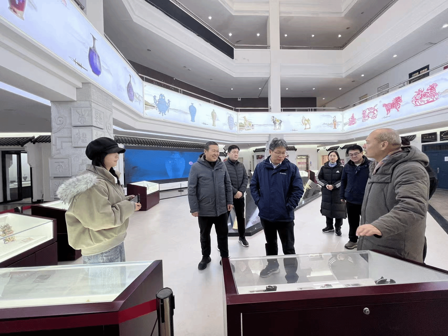 中原民间艺术资源陈列馆调研指导工作。学院党政班子成员、专业教师代表及学生骨干参与调研。学院领导详细汇报了陈列馆的建设理念、资源整理成果以及在学校美育教育、教学科研中的应用规划。阚云超实地查看了陈列馆的展陈布局、非遗藏品保护情况及数字化展示平台,并对学院在传承中原文化、整合民间艺术资源方面取得的阶段性成果表示肯定。