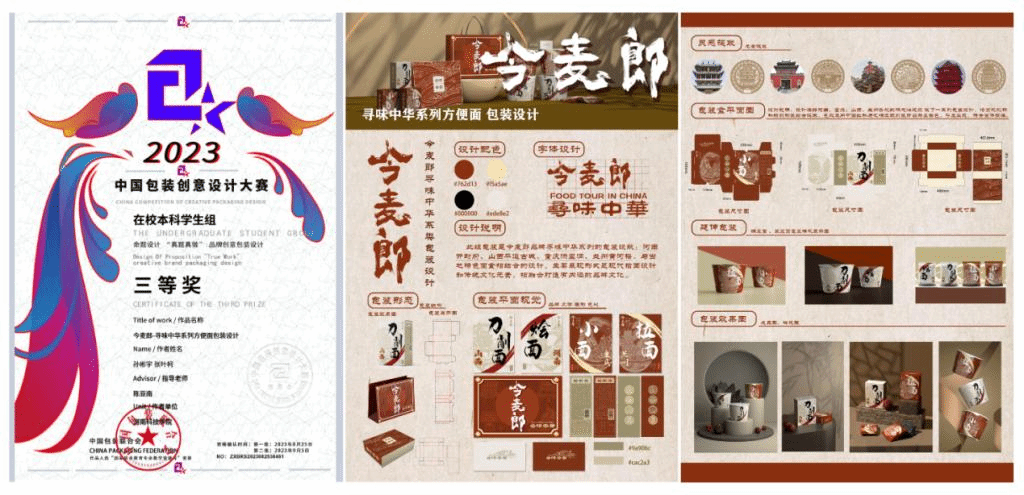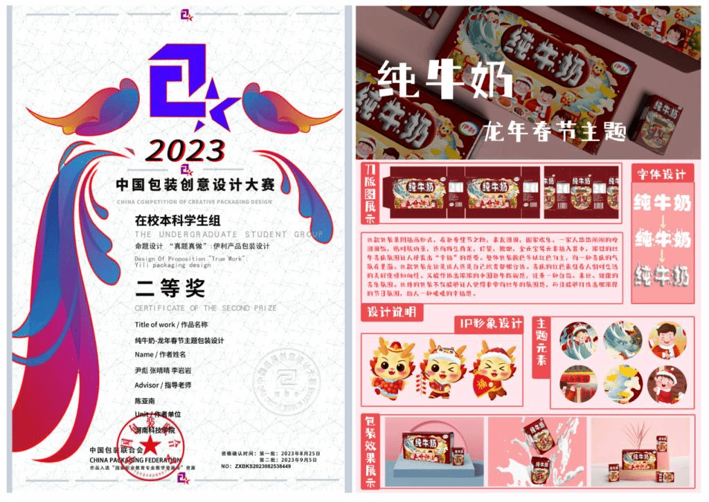 参赛学生再创佳绩,荣获二等奖1项,三等奖4项,优秀奖3项。由陈亚南老师指导、尹彪等同学设计的伊利产品包装设计作品《纯牛奶-龙年春节主题包装设计》获得二等奖;孙彬宇等同学的品牌创意包装设计《今麦郎-寻味中华系列方便面包装设计》等4件作品获得三等奖;王琪等同学的《栗子来了-栗子系列包装设计》等3件作品获得优秀奖。