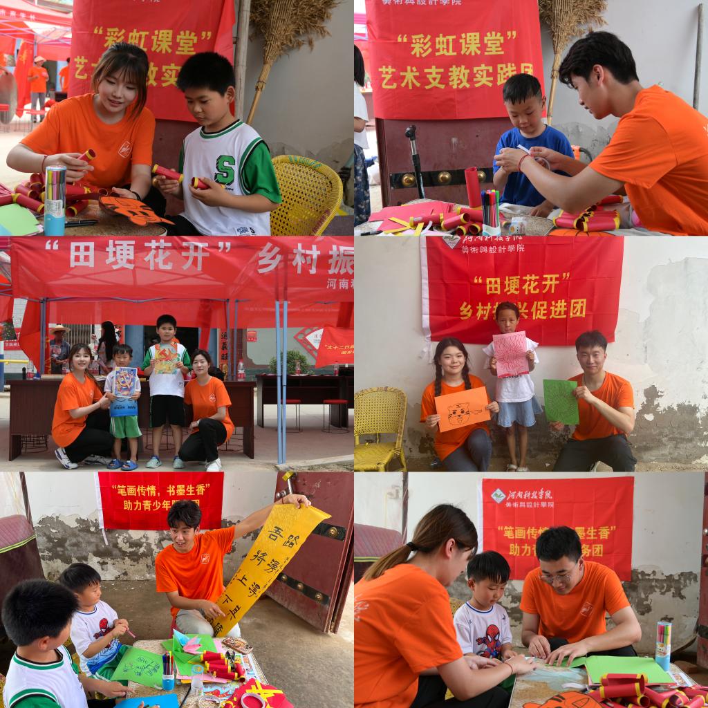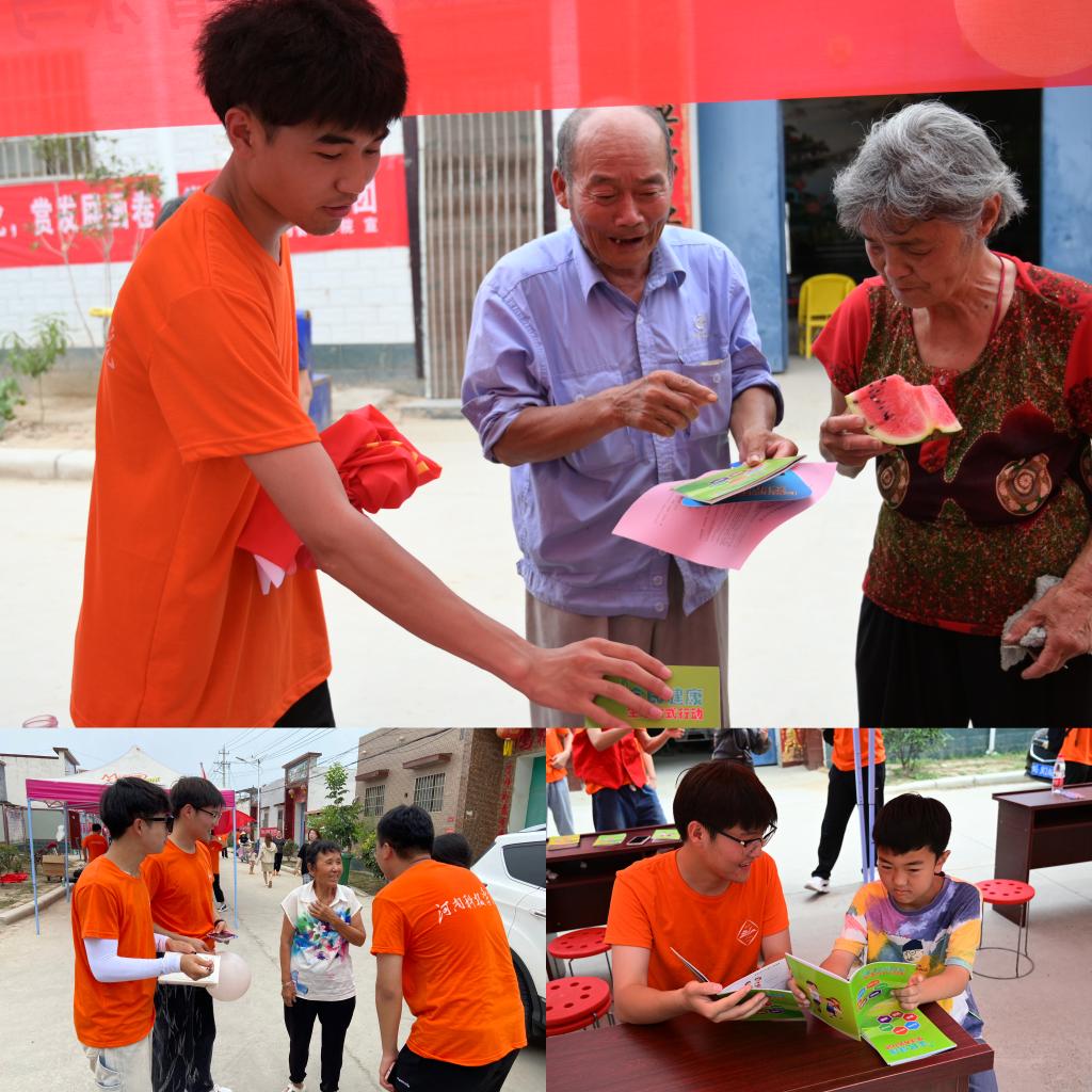 在“彩虹课堂”艺术支教的现场,实践队员一对一教小朋友们绘出心中最美的家乡风景,手把手指导孩子们折叠小船和制作手工“小老虎鞭炮”;在农民伯伯的田地中,实践队员与村民交谈不同地域农作物种植管理的差异,分享各自能够取得丰收的小妙招,并热心帮助村民摆放水管、进行灌溉;在闫庄村的帐篷下和街道的各个角落,实践队员们迎着酷暑给小朋友们耐心地讲解防溺水、防中暑等安全小常识;在党员同志家中,实践队员们兴致盎然地听党员讲故事,认真记笔记,希望从中汲取奋进力量。