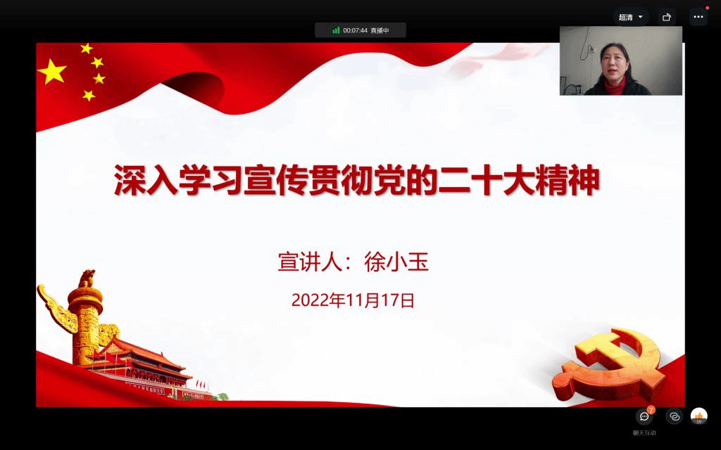 艺术学院党委副书记徐小玉以《学习党的二十大 让青春在党旗下闪光》为题,在钉钉会议给全体学生党员及入党积极分子宣讲党的二十大精神。会上,徐小玉结合艺术学院学生专业特点和思想实际,以大量实际案例现身说法,鼓励广大学生党员和入党积极分子要以实际行动投入到学习贯彻党的二十大精神热潮中。