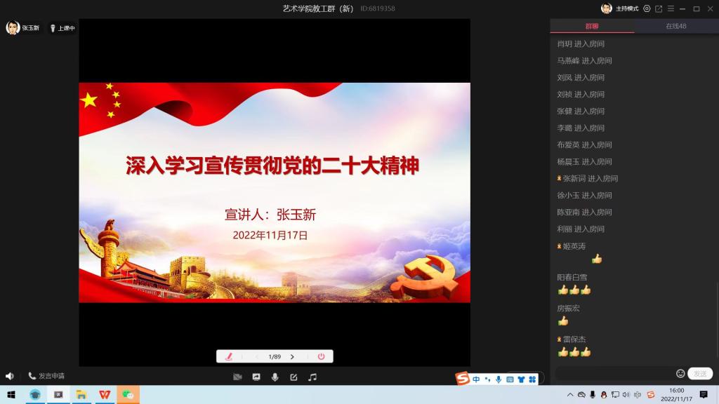 11月17日,艺术学院党委书记张玉新以《艺术学院深入学习贯彻党的二十大精神》为题,在QQ群课堂给全院教工宣讲党的二十大精神。会上,张玉新结合学院工作实际,重点围绕党的二十大主题和主要成果、过去5年的工作和新时代10年的伟大变革、马克思主义中国化时代化、中国式现代化、全面建设社会主义现代化国家的目标任务、坚持党的全面领导和全面从严治党、应对风险挑战等7个方面,对党的二十大精神进行了宣讲。