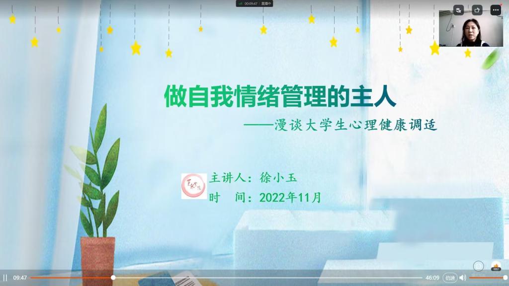 徐小玉以《做自我情绪管理的主人——漫谈大学生心理健康调适》为题,和同学们畅谈了三个问题:“我”的情绪“谁”做主;“我”的情绪为何总被他人左右;学会做自我情绪管理的主人。她结合疫情防控要求下学校封闭管理期间发生在同学们身边的真实案例,与大家探讨了如何科学的认知“压力管理”,分享了积极心理学上的“认知疗法”,鼓励同学们学会科学的情绪管理,学做自己的情绪管理专家,成为自我情绪的主人;希望大家增强大局意识,学会换位思考,特殊时期更要严格遵守校规校纪,“我为人人”才能享受“人人为我”。
