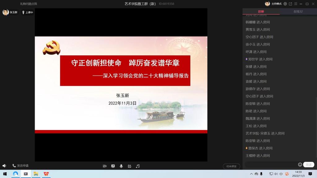 11月3日下午,艺术学院党委书记张玉新以“守正创新担使命,踔厉奋发谱华章——深入学习领会党的二十大精神辅导报告”为题,在QQ群课堂给全院教工宣讲党的二十大精神。