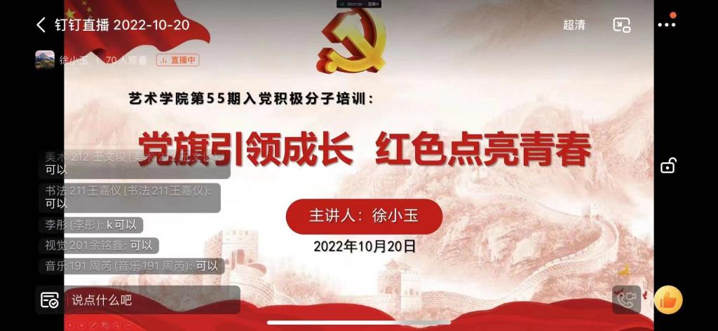为进一步加强对入党积极分子的教育和培养,坚定入党积极分子理想信念,10月20日,艺术学院党委在线上举办第五十五期入党积极分子党课培训开班典礼,艺术学院党委书记张玉新、党委副书记徐小玉、团委书记刘凤、团委副书记陈晓华、团委副书记张腾玮、辅导员杨丹,以及80余名入党积极分子参加了会议。