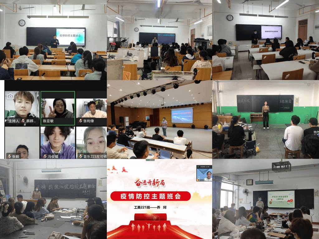 9月27日—10月14日,艺术学院全体“包班联点”教师严格按照学校各项疫情防控工作规定,陆续召开了校园安全稳定暨疫情防控主题班会,提醒同学们:一要绷紧疫情防控这根弦,严格遵守学校疫情防控各项规定,做好个人防护;二要加强宿舍安全防范意识,严禁使用违章电器,注意防火及用电安全;三要强化网络安全意识,守法用网、文明上网,营造健康文明的网络环境;四要志存高远、脚踏实地,学好知识,打好基础,增长才干,科学合理规划大学生活。