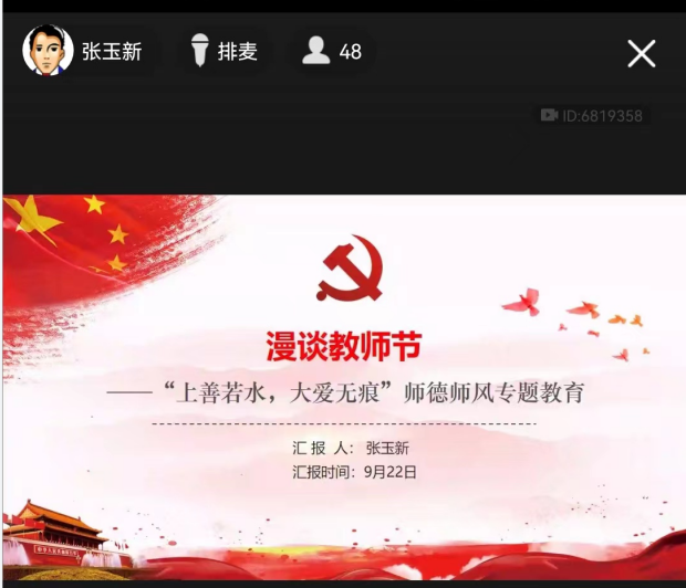 为全面加强学院教师师德师风建设,提高教师职业素质,9月22日,艺术学院党委书记张玉新在QQ群课堂以《漫谈教师节——“上善若水,大爱无痕”师德师风专题教育》为题给学院教师开展师德师风专题教育讲座,学院全体教工聆听了此次讲座。