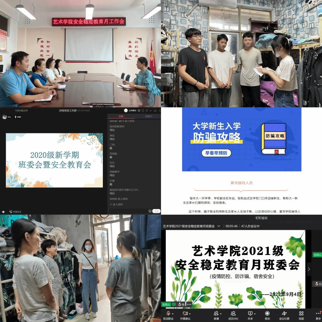 9月1日,艺术学院召开新学期工作部署会,党委书记张玉新、院长张新词在会上特别强调了做好学生安全稳定工作的重要性。2日,学院在11208会议室召开全体辅导员老师的学生安全稳定教育月工作部署会议。会上,徐小玉传达了学校及学院关于安全稳定工作的最新通知精神,各年级辅导员就学生的思想政治教育和管理工作,围绕着总体思路、具体措施、存在问题以及努力方向等内容进行了深入研讨。2日至5日,各年级辅导员通过召开年级班委会、走访学生宿舍、组织打扫专业教室卫生、一对一心理咨询、加大思想宣传力度、解决受灾宿舍学生的实际困难、做好返校隔离学生和未返校学生思想安抚等形式,用实际工作认真落实会议精神,与学生面对面亲切交谈,提醒同学们严格遵守疫情期间的各项管理规定,注意宿舍用水用电安全,谨防电信网络诈骗,做好新学期学习生活规划,在奋发进取中不断提升自我。
