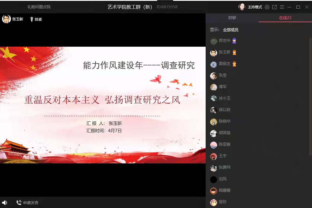 为深入推进“能力作风建设年”活动,提升教职工素质能力。4月7日下午,艺术学院党委书记张玉新在QQ群课堂以《重温反对本本主义 弘扬调查研究之风》为题给全体教职工做调查研究专题讲座。