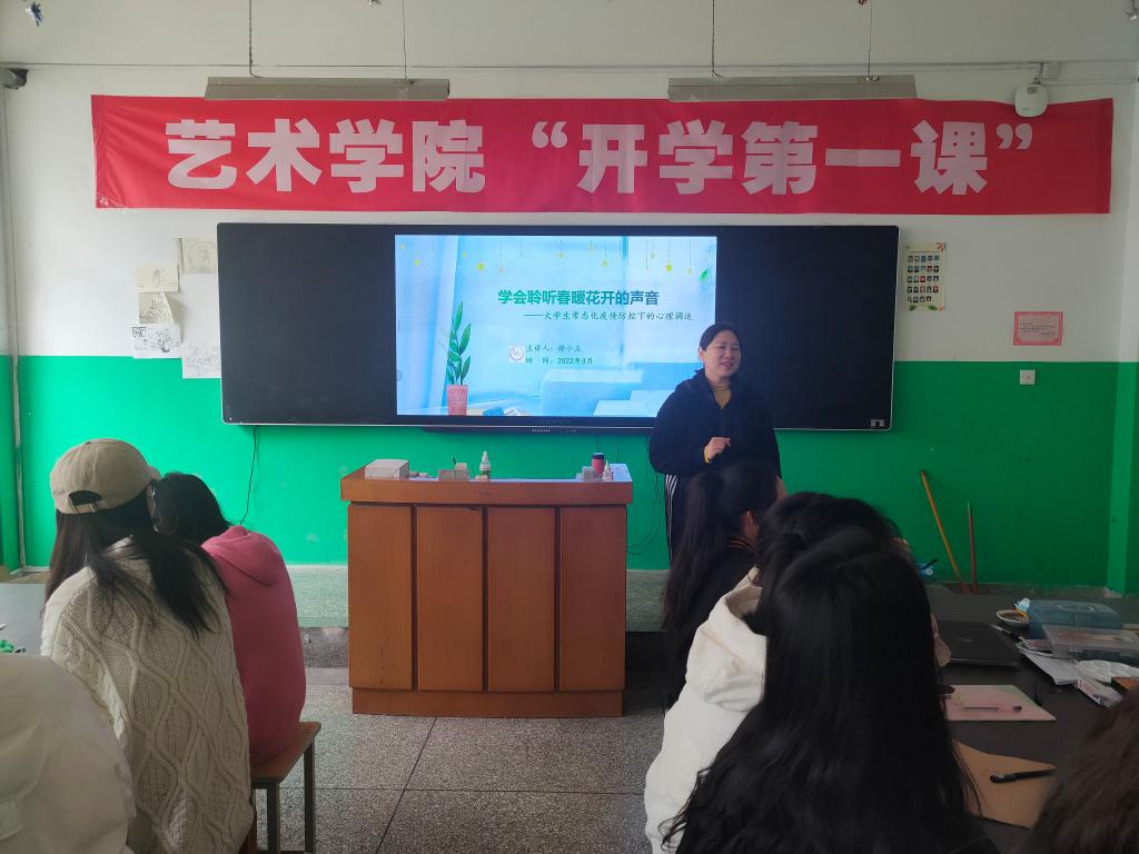 为了更好的帮助学生适应常态化疫情防控之下的大学生活,3月29日上午,艺术学院党委副书记徐小玉在2号教学楼102教室进行了专题心理讲座,2021级音乐班40余名同学一起聆听了讲座。