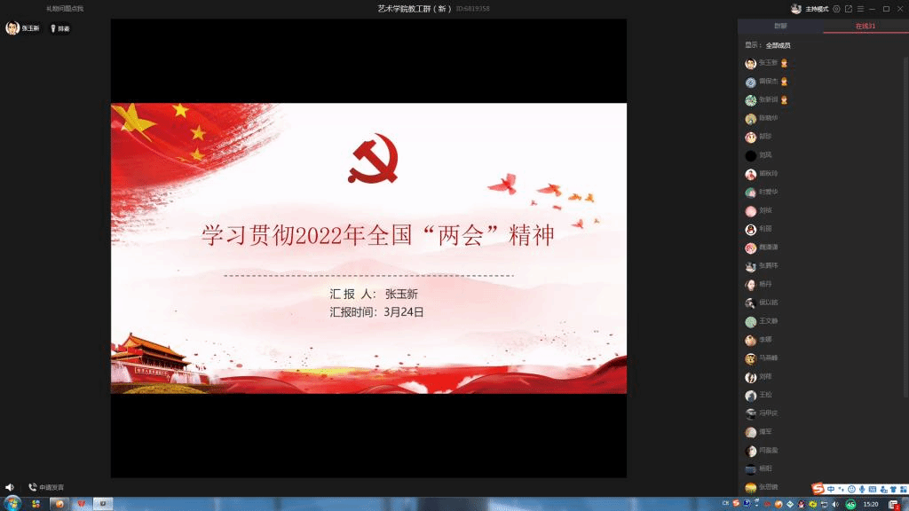 3月24日下午,艺术学院党委在QQ群课堂召开专题会议,学习传达2022年全国“两会”精神,学院全体教师参加了此次会议。会议由学院党委书记张玉新主持。
