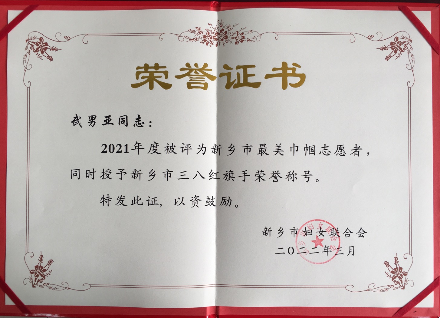 教师武男亚被评为2021年度新乡市“最美巾帼志愿者”,同时被授予新乡市“三八红旗手”荣誉称号,成为驻新高校中唯一获此殊荣的教师。
