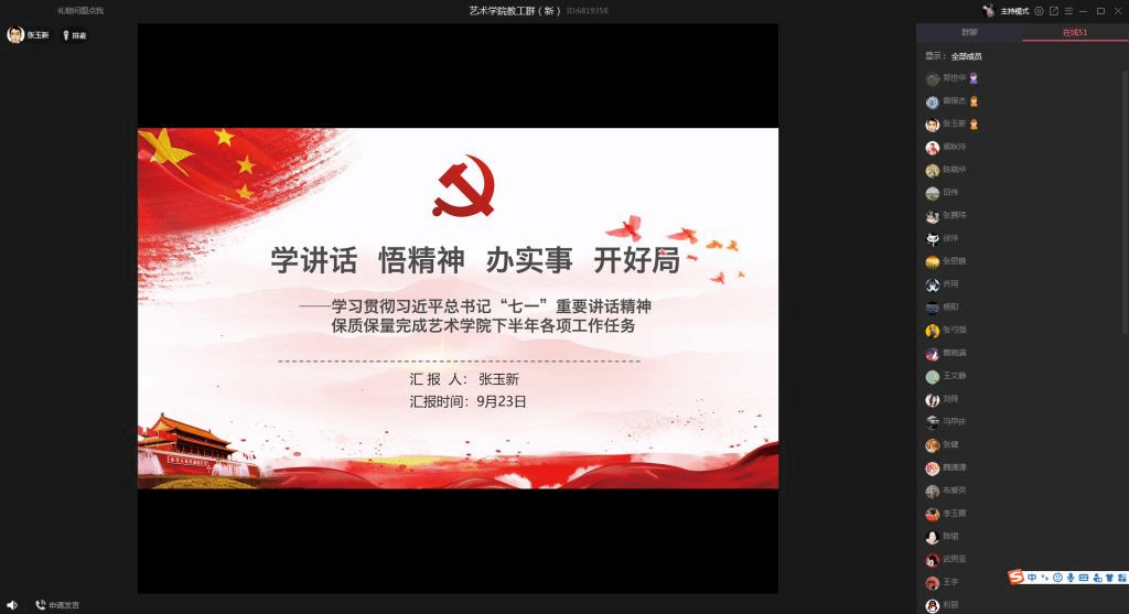 9月23日下午,艺术学院党委书记张玉新以“学讲话 悟精神 办实事 开好局——学习贯彻习近平总书记‘七一’重要讲话精神,保质保量完成学院下半年各项工作任务”为题,在QQ群课堂给全院教工宣讲习近平总书记“七一”重要讲话精神。