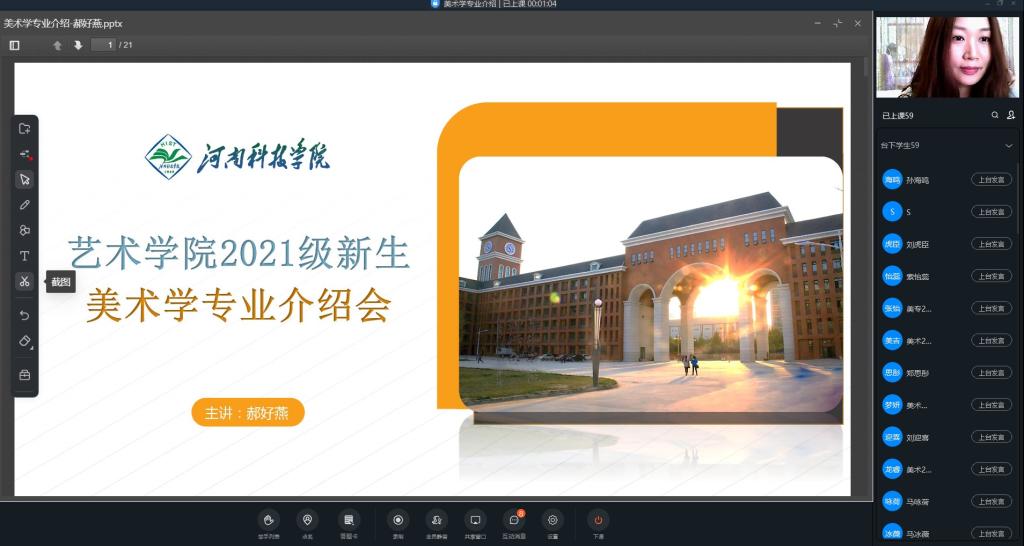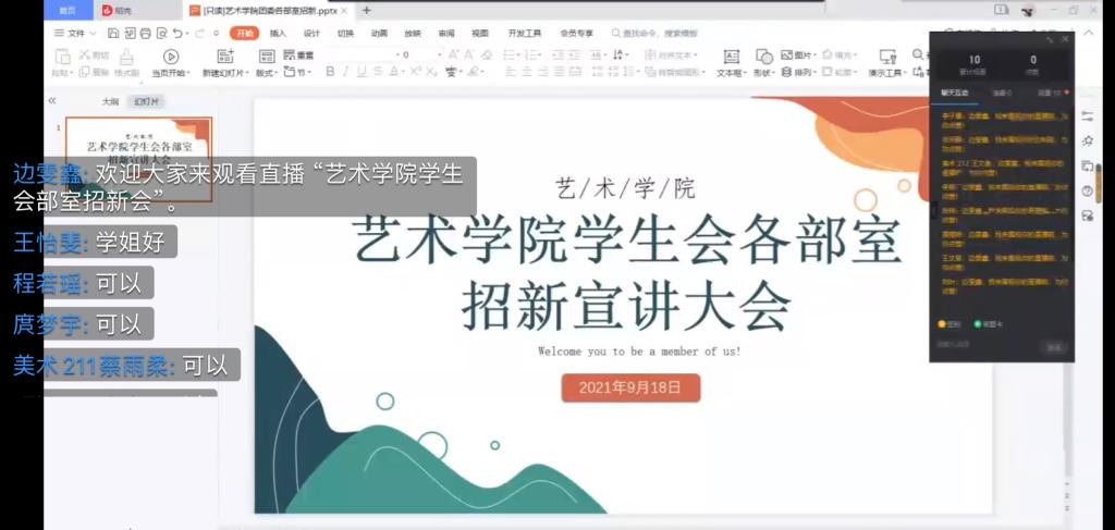 9月17日下午15:00——16:00,艺术学院团委副书记、学生会主席团成员首先和新生进行视频见面会议,提前介绍了团委学生会各部门情况。9月18日上午,艺术学院团委学生会各部室开始招新宣讲,让21级新生了解了艺术学院团委学生会的工作内容。各个部室的部长详细介绍了自己部门的特点、工作内容等方面,让学生可以根据自身的特长加入自己喜欢的部门,既丰富了大学生活,又提升了个人能力。