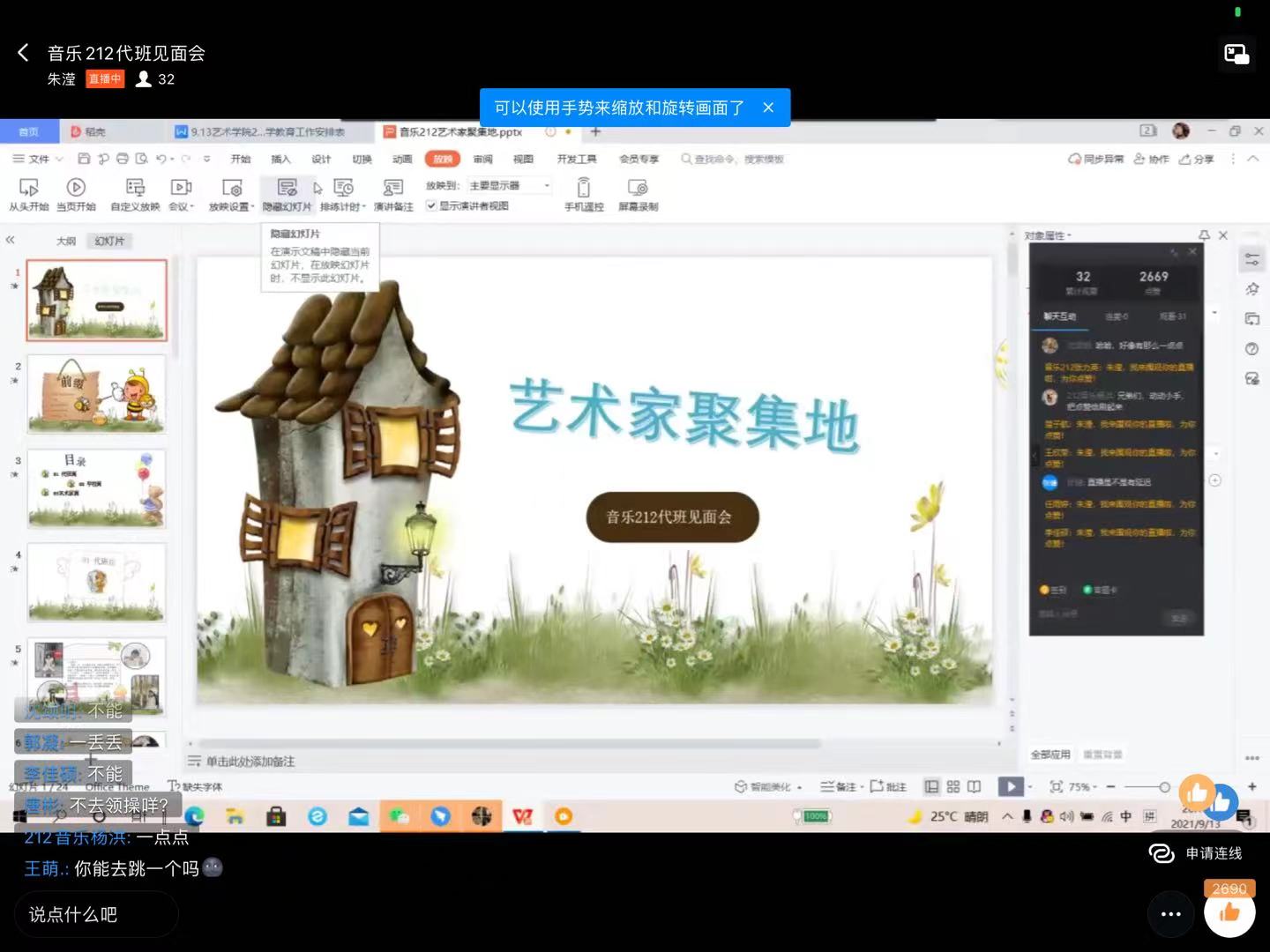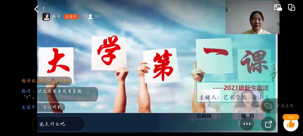 9月13日上午8:00—9:00,全体21级新生在线上观看学校秋季“开学第一课”,听取校党委书记周志远讲话、副校长冯启高讲话与师生代表发言,了解了学校疫情防控的最新要求。上午9:30—10:30由艺术学院党委副书记徐小玉在钉钉上召开了2021级新生入学教育的讲座——“大学第一课”,她围绕着当代大学生的独立、安全、纪律、交友、学习和就业五大方面,引导同学们尽早树立正确的人生目标,规划好自己的大学生活。讲座中,同学们认真聆听,热烈留言互动,在徐书记的引导下,大家纷纷刷起了“争做奋斗的艺术学子”的消息,决心要做到独立思考、独立生活、独立奋斗,在大学四年时间里书写下奋斗的诗篇。