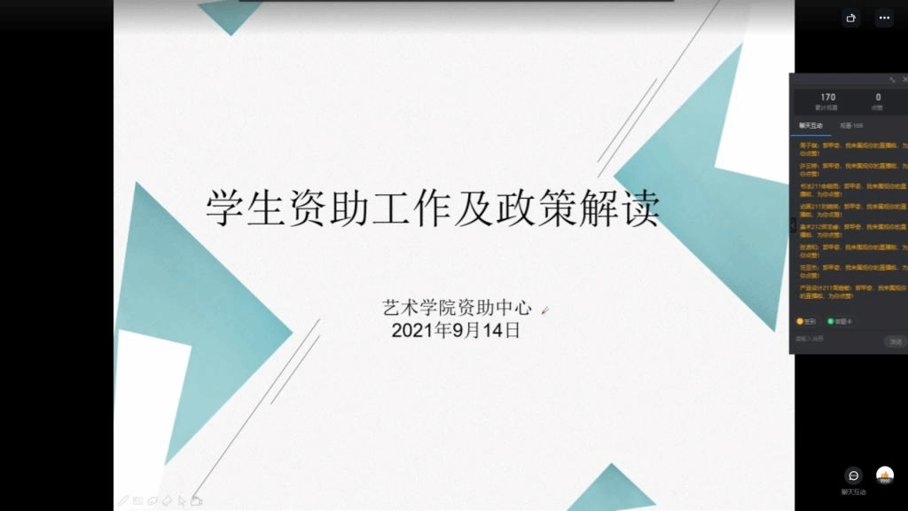 9月14日下午15:00—16:00,由艺术学院资助中心为21级新生进行大学生奖助贷专题讲座,让学生们了解了奖学金、助学金和助学贷款的现实意义以及申请的时间、条件和流程,一方面能为更多学生安心读书提供强力支持,激励学生们好好学习,另一方面可以培养学生诚信、感恩的美好品质。