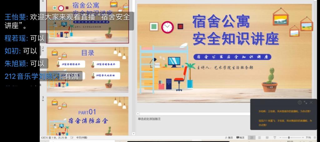 生活服务部成员首先对21级新生进行宿舍安全管理培训,为后期学生们顺利开启校园生活,提高宿舍安全意识奠定了基础。随后,部门成员又给新生传递了装饰宿舍的小技巧,希望每位同学都能凭自己双手打造一个温馨舒适的宿舍环境。最后,成员通过一张张活动图片的讲解为新生介绍宿舍文化活动。此次讲座不仅强化了学生们的内务整理的能力,而且也增强了宿舍同学之间的凝聚力,为之后开学宿舍卫生检查、日常相处等方面夯实了一定的基础。