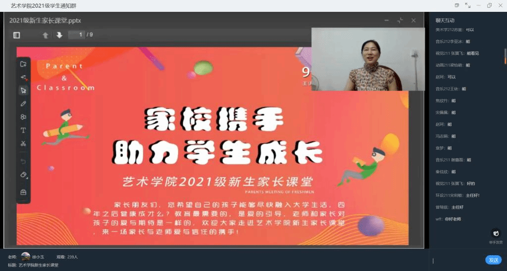9月17日晚上19:30—20:00,由艺术学院党委副书记徐小玉在线上开展2021级新生家长课堂,大学并非是孩子们的终点,而是一个全新的起点,不光需要孩子们走稳大学的第一步,也需要家长积极配合,共同用爱去教育自己的孩子,与学校老师们共同培养一个未来的栋梁之材。