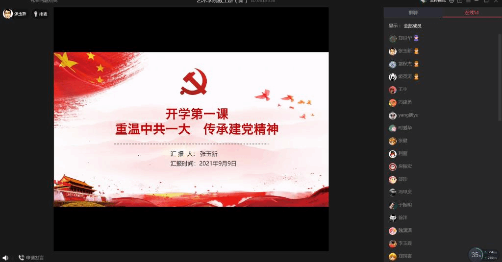 9月9日下午,艺术学院党委书记张玉新以《重温中共一大 传承建党精神》为题,在QQ课堂给全院教工讲了专题的“开学第一课”。