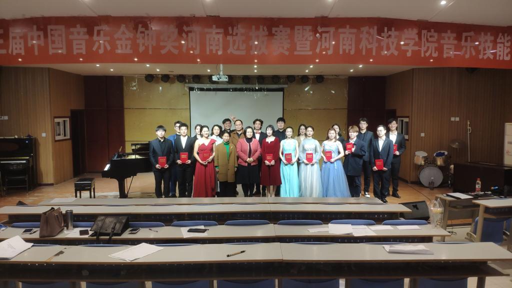 中国音乐金钟奖是由中共中央批准设立的、全国唯一常设的音乐综合性大奖。根据“第十三届中国音乐金钟奖河南选拔赛”比赛的文件,音乐技能大赛分为二场进行。3月29日器乐——钢琴组、古筝组,3月30日声乐——美声组、民族组。此次比赛有近二百名选手参赛,四十余名选手进入决赛,比赛最终决出特等奖5名(美声组并列),一、二、三等奖、参与奖若干。其中钢琴组韩昱升、古筝组李彦璇、美声组商艺、民族组徐家峰四位同学推荐参加河南省音乐金钟奖比赛。比赛中,参赛选手充分展现了他们的音乐才能和舞台风采,以不同的方式诠释着自己对作品的理解。比赛结束,校院领导和部分评委老师给获奖选手们颁发了证书并合影留念,音乐技能大赛在掌声中圆满结束。