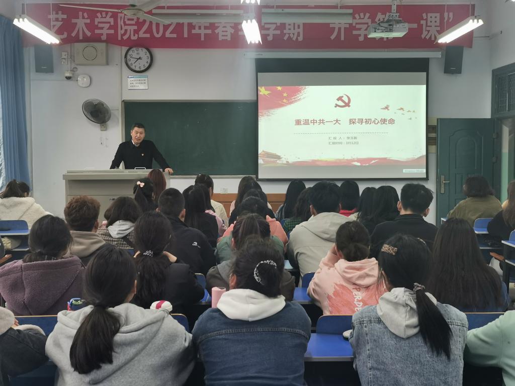 按照学校通知要求,为扎实做好春季学期开学后的“开学第一课”工作,艺术学院党委高度重视,专题研究专题布置,学院所有领导班子成员都将陆续深入课堂给学生讲授专题的“开学第一课”。3月12日上午,艺术学院党委书记张玉新在6204教室率先开讲。