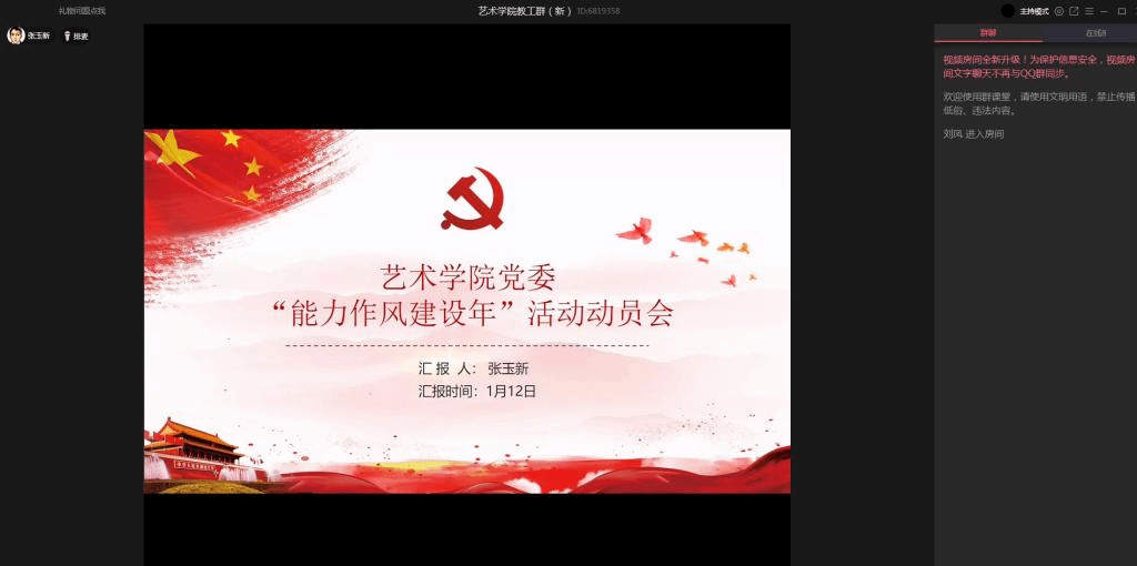1月13日,艺术学院党委在艺术学院QQ群课堂召开“能力作风建设年”活动动员会,艺术学院处级干部、正科级干部、党支部书记、辅导员10余人参加了会议。