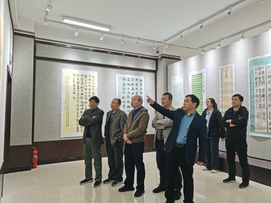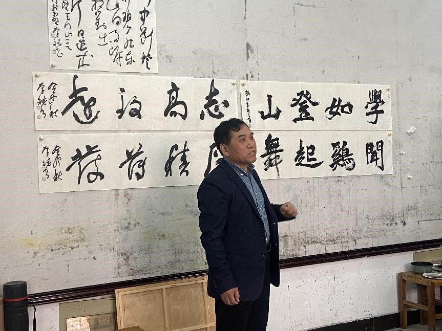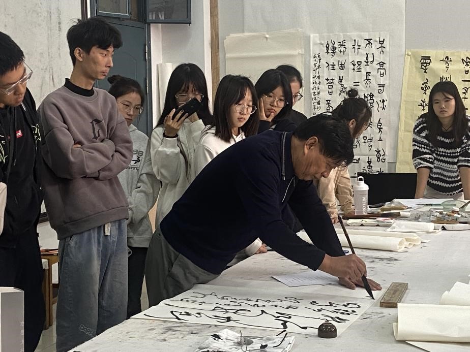 参观结束,张新词一行又参加了书法专业举办的艺术创作交流会。会上中国书协会员、辉县市书协顾问穆学斌老师与赵泉有老师共同为书法专业同学进行书法创作示范、并分享书法创作心得体会。在二位老师分享中,同学们受益匪浅,书法认识不断提高。