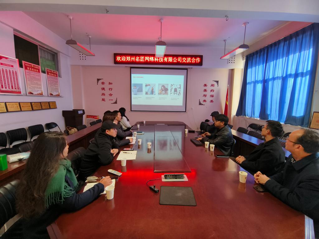 与郑州名匠网络科技有限公司在11#208会议室举行了一场校企合作交流会。院长雷保杰、副院长胡国锋及相关专业老师参加了会议。