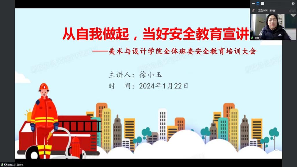 22日下午,徐小玉通过腾讯会议给学院一百余名班委进行了一次专题授课。她以《从自我做起,当好安全教育宣讲员》为题,围绕着安全宣讲的主线,强调作为班委更要从思想上重视安全工作;不仅自己要重视,更要宣讲好,带领全班同学增强安全意识。她强调指出,没有做不通的思想问题,只有做不到位的宣传工作。广大学生干部一定要以身作则,积极营造安全的假期环境,确保每位同学都能度过一个平安、愉快的寒假。