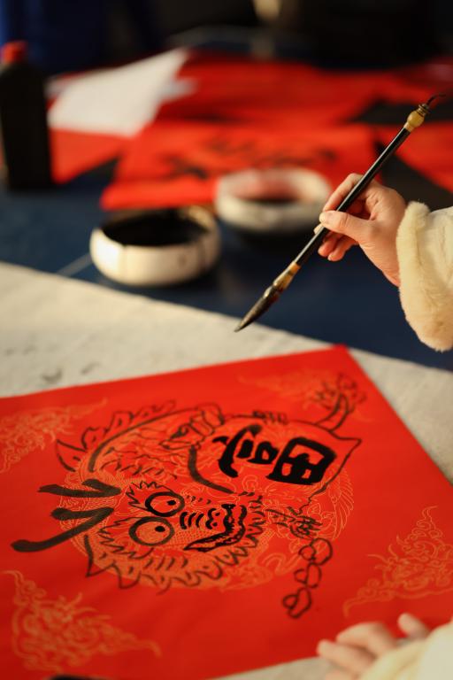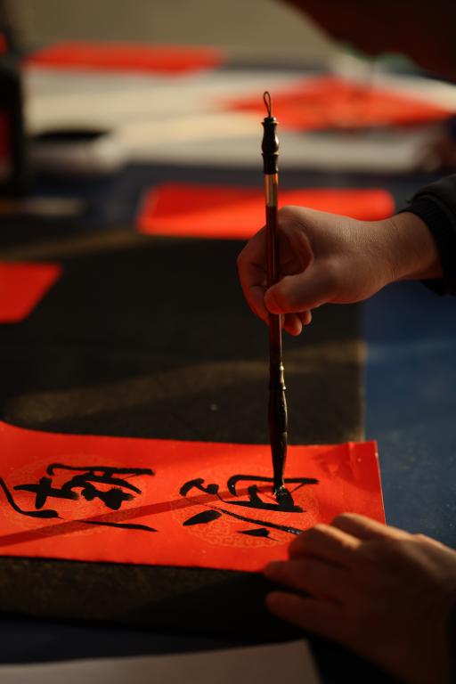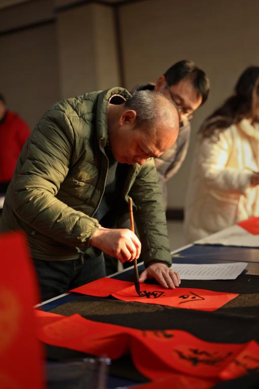 沐浴着校园的温暖阳光,另一个场地弥漫在大厅的是翰墨书香。学院领导和书法专业老师们亲手为同事们书写出一幅幅喜庆的春联,勾画出一幅幅动人的龙年特色福字,为即将到来的中国传统新年更增添了喜庆氛围。
