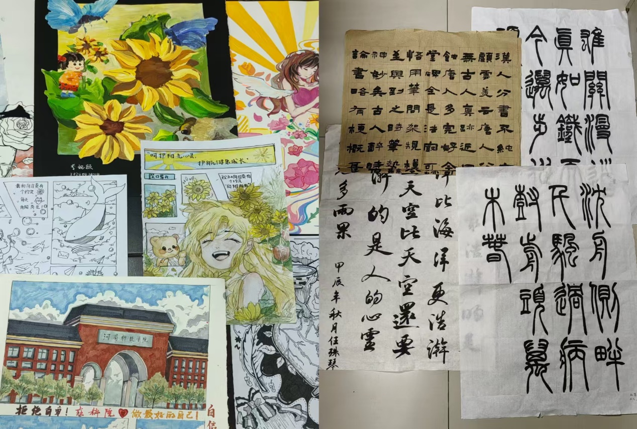 举办了心理健康书画、文创大赛,为心理健康增添色彩。同学们发挥专业特长,用画笔将热爱生活、青春飞扬的画面描绘在一幅幅书画和设计作品中,通过书画和设计传递积极向上的情感,促进心灵的美好交流。