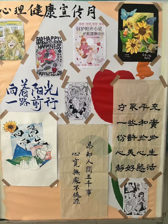 绘制了心理健康宣传月展板,用明艳的色彩画出守护心灵健康的元素,将书画、文创大赛的部分作品粘贴在展板上,传递了乐观心态和积极健康的心理理念。