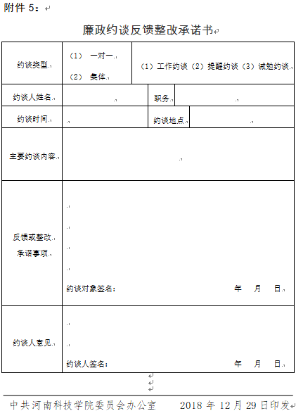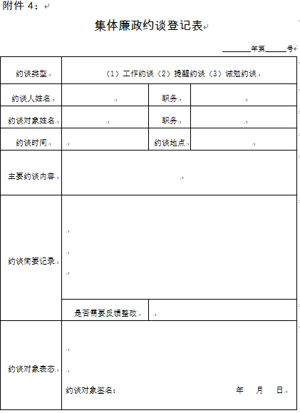 (四)谈话结束后,各基层党委、党总支要将《廉政约谈登记表》《廉政约谈反馈整改承诺书》等相关资料,一份存档,一份交纪委办公室备案。