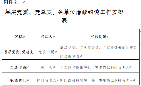 (三)各基层党委、党总支和全校各单位,认真组织好本单位的副处级领导干部和重要部门、关键岗位的科级干部的谈话工作,做好现场记录及存档工作,党委办公室、纪委办公室将对各基层党委、党总支和各单位约谈工作开展情况进行督查。(具体约谈安排详见附件2)